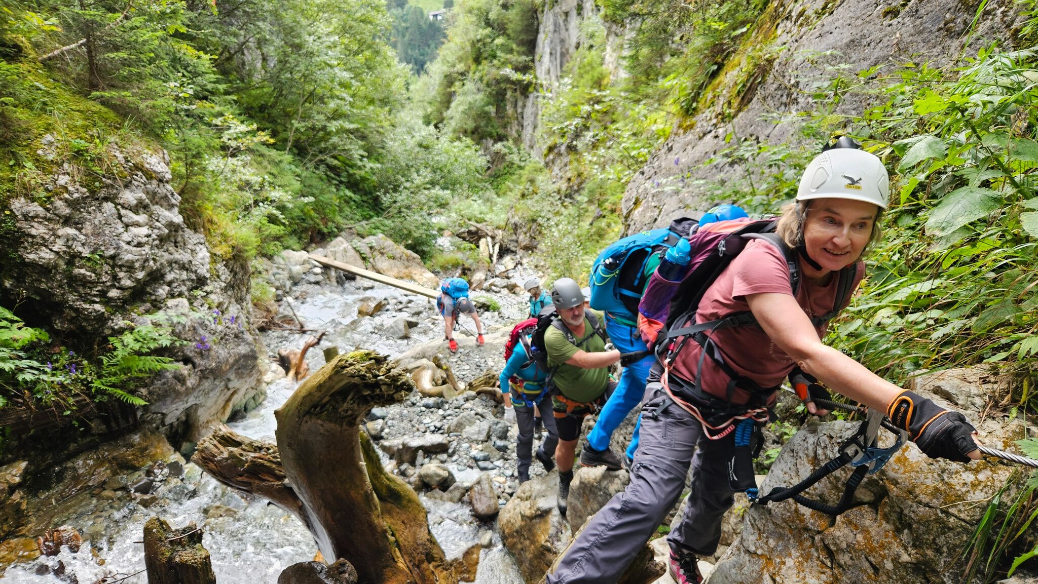 Unser erstes Ziel war die Röbischlucht, ein guter Start zur Standortbestimmung (A/B, B und eine B/C-Stelle). Der Weg entlang des Baches war gut gesichert, viele Eisen. Die wenigen Felstritte (und auch die Eisen) aber durchgängig feucht, also auch rutschig.