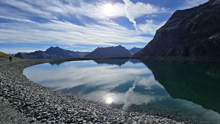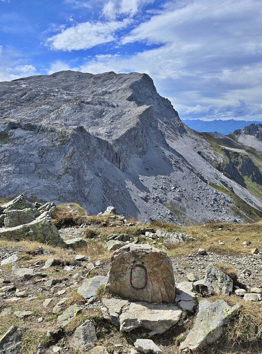 Nach gewohnt bewegter Verabschiedung der Klettersteigler- und -innen, die ihre getrennten Wege einschlagen, führt uns die Wanderung unterhalb der Gargellner Köpfe entlang vorbei am Speicherteich Schafbergsee unschwer bis zum Gafierjoch , 2.415 m, an der Grenze zur Schweiz, wo Martin mit seinen Schweizer Wurzeln, am Grenzstein, die Passkontrolle vornahm.