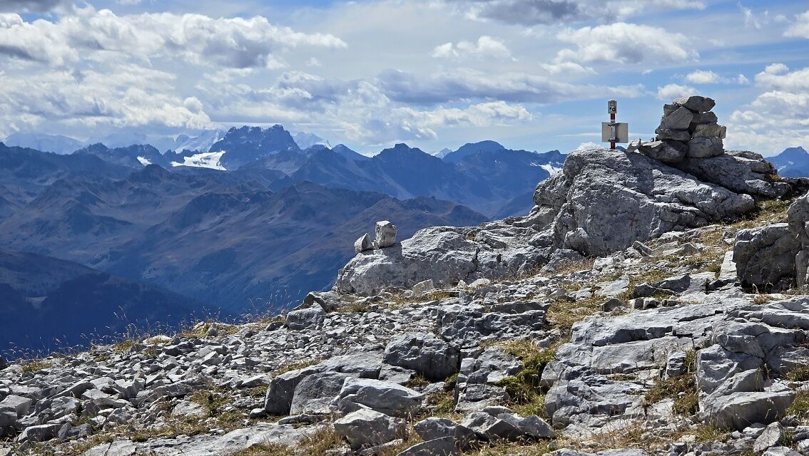 Ein steiler, enger, auch rutschiger Steig führt leider wieder 100 hm bergab bevor man sich genussvoll dem lang geschwungenen Aufstieg zuwenden kann. Optisch sehr beeindruckend führt dieser exakt entlang der Grenze zwischen dunklem Gneis zur Linken und hellem Kalkgestein zur Rechten dem Gipfel zu. Unsere drei Langbeine steigen noch links steil zum Rätschenjoch, 2.602 m auf, um sich einen Blick nach Süden zu gönnen, während das gesetzte Alter direkt dem Gipfel zustrebt. Über fast gletscherweiße Steinplatten und mehr als großzügig geröllbestreute Stufen geht es nun dem Gipfel zu, der von der Aufstiegsseite oben fast flach wird, nach Westen aber einen markanten Abbruch zeigt. Wir genießen die herrliche, überaus weite Aussicht nach allen Richtungen und eine angemessene Gipfelrast in einer windgeschützten, sonnigen Mulde.